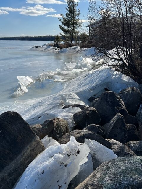 Another picture of the ice being pushed up onto the shore, this time between cabins 3 and 4. We keep saying we’ve never seen this before. The ice is still thick but you have to be careful when out on it, know where you’re going to avoid any dangerous areas.