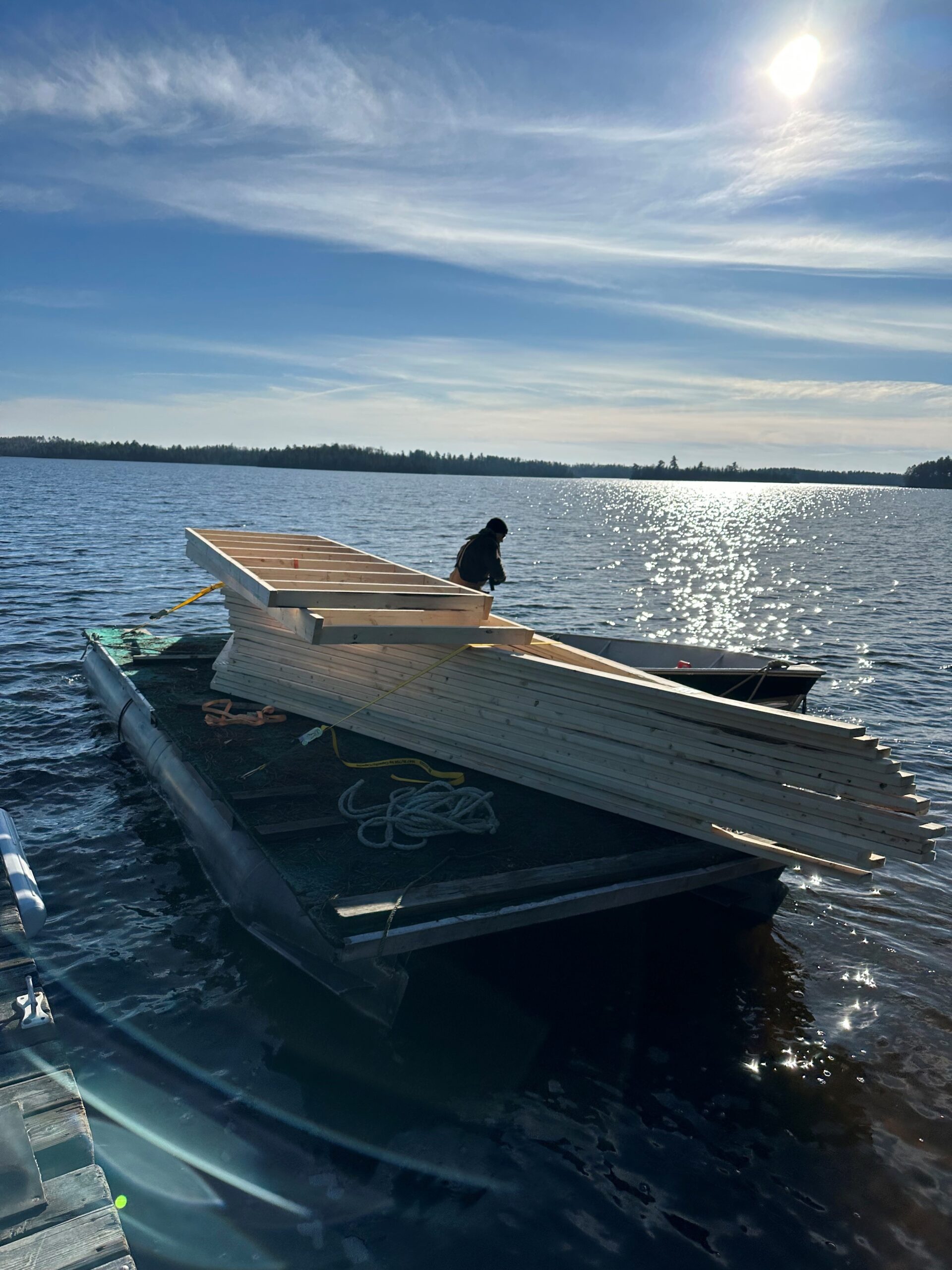Well, yesterday was a perfect day to get the trusses to the island. They were loaded up onto the pontoon boat then it was a slow ride to the island. But winds were minimal so the journey was smooth. Now Don will wait till weather improves to get the trusses in place.