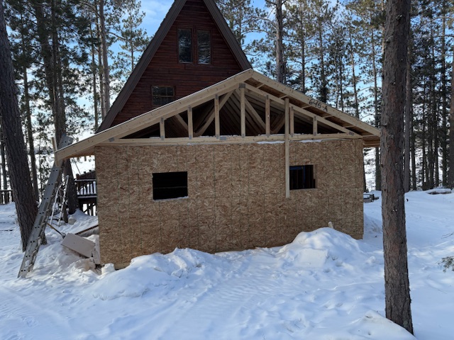 The roof is on the addition to the Island cabin. With the frigid temperatures all work has stopped but warm temperatures will prevail so the tin on the roof will be installed soon. There’s still a lot of work to be done on the inside.
