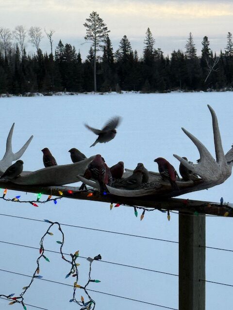 Moose antlers make for the perfect bird feeder. The birds either eat seeds or take a rest. We’ve had plenty of Grosbeaks, Chickadees and Whiskey Jacks, the odd Nuthatch but no Blue Jays.