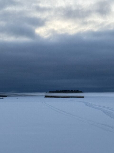 Our view this morning, a line of fog hovering over the lake. Shortly after I took this photo the fog settled and you couldn’t see the island. A short time after that the fog lifted. It’s a cloudy morning but we expected to have some sunshine this afternoon and above freezing temperatures. Yesterday, we received about 5 inches of snow, enough for Don to plow this morning.