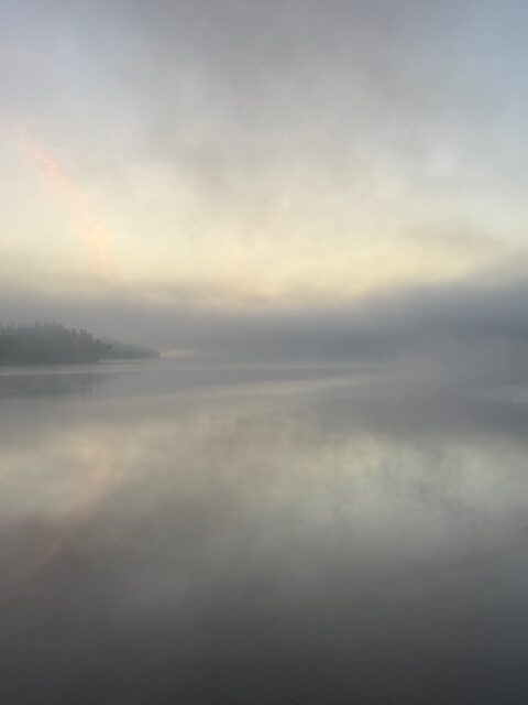 Our morning view, heavy fog over the lake, minus 13C. We can see ice beginning to form out in the middle of the lake.