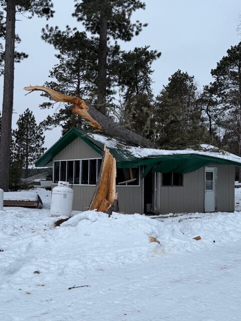 We had a very windy night and day early this week and it blew this tree down over the fish house. At Christmas time, Don had been thinking he would have to cut that tree down. Now he has to repair a building. Just something more to add to his list.