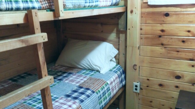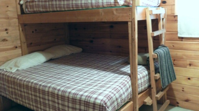 7 bedrooms; 3 downstairs (each with a queen bed and a single bunk on top), 4 upstairs